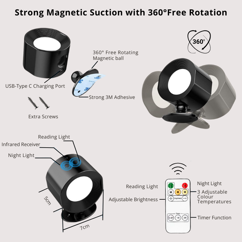 - The LED Wall Lamp connects to the wall mount with a 360° rotating magnetic ball that allows you to rotate the direction of the light source according to your needs