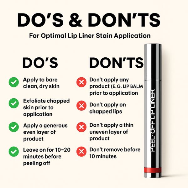 Apply the product carefully around the lips, let it dry for 15-20 seconds, and gently peel off for a clean, transfer-proof stain. No liner or lipstick needed afterward.
